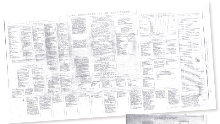 ¡VES ESTO, VES ESTO!, le gritaba Miguel Nazar mientras desplegaba sobre el escritorio de su oficina un largo rollo de papel tapizado con decenas, cientos de nombres, fe- chas; recuadros perfectamente trazados y alineados con datos y más datos, todo bajo un título: Liga Comunista 23 de Septiembre…